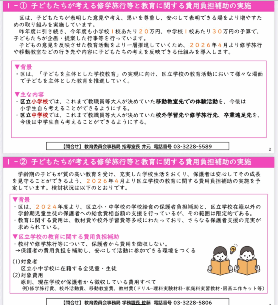 子ども文教委員会で、教材費と修学旅行等の無償化が報告、会派で求めてきた「隠れ教育費の無償化」を評価。