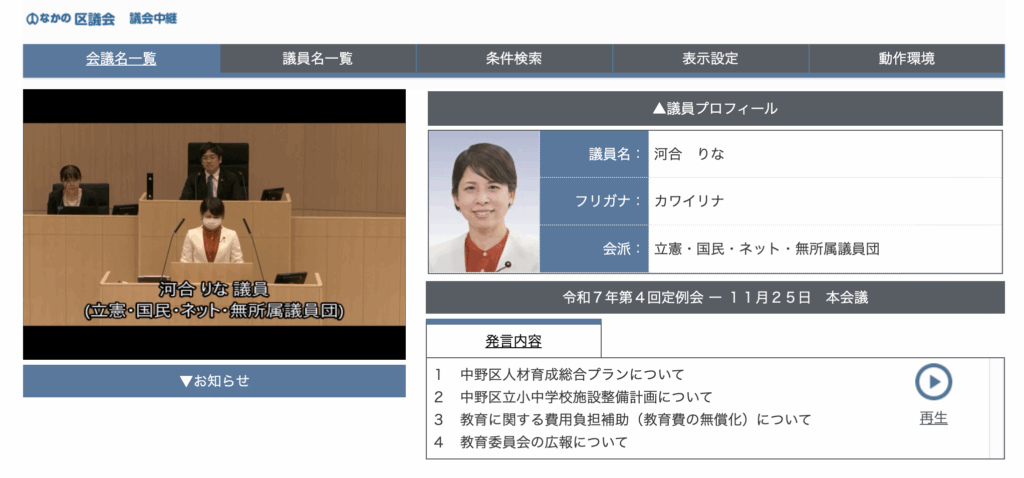 ▼令和7年11月25日中野区議会本会議(第4回定例会)の会議録(河合りな発言)